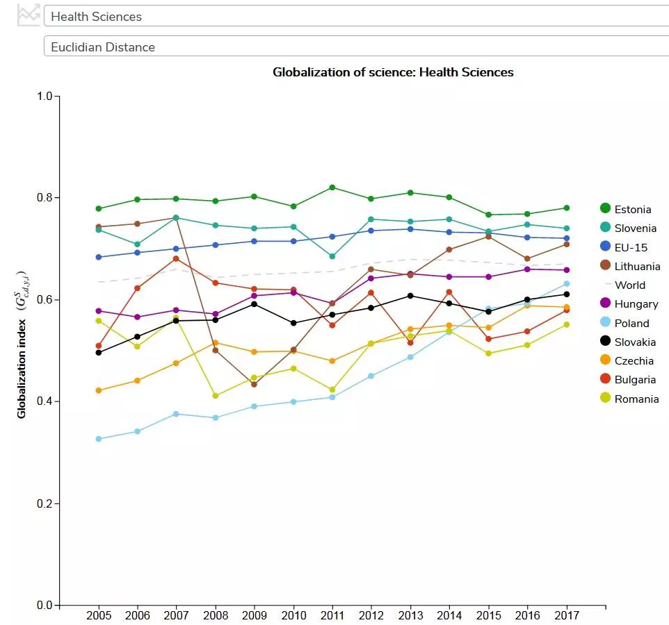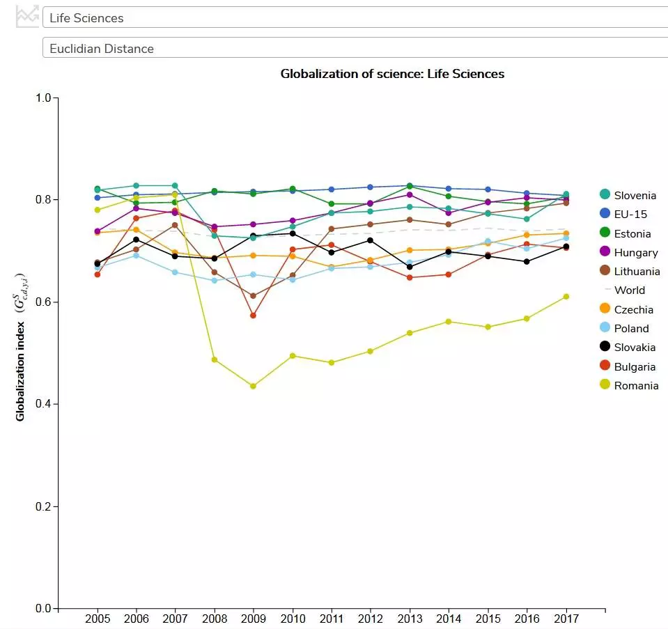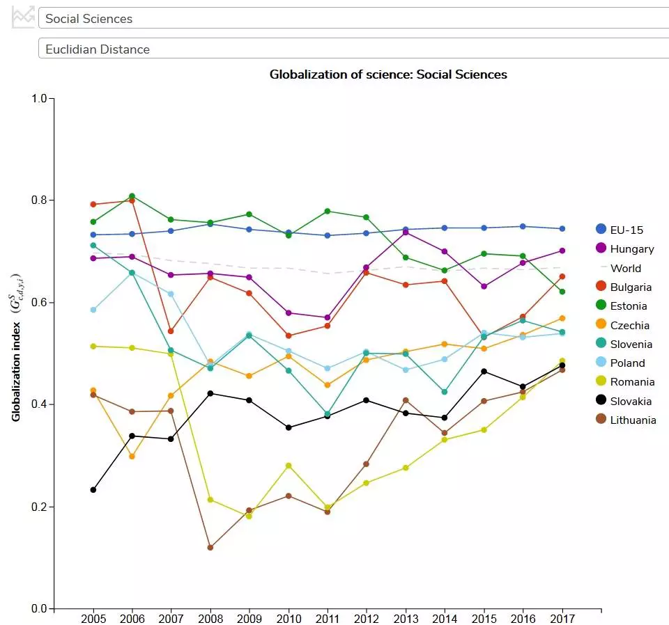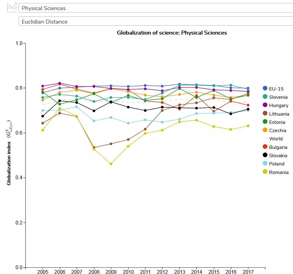 Ale teď již k zmíněné nové interaktivní aplikaci IDEA Martina Srholce a Víta Macháčka. Ta ukazuje časové řady globalizačního indexu pro uživatelem vybrané země a vědní obory v období po roce 2004. Míra globalizace vědy dané země je odvozena od podobnosti struktury časopiseckých publikací dané země s publikační strukturou globální.