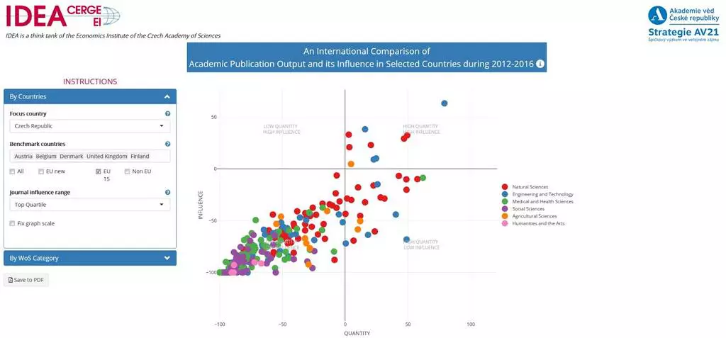 Druhá aplikace se váže na odborný článek Jurajda, Š., Kozubek, S., Münich, D. & Škoda, S. 2017. “Scientific publication performance in post communist countries: still lagging far behind”, Scientometrics, Volume 112, Issue 1, pp. 315–328.