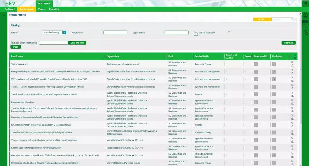 - On-line aplikace panelistovi zatím neumožňuje sledovat ani přiřazení výsledků hodnotitelům v jiných oborech panelu, ani sledovat výsledky hodnocení výsledku v nich. To považuji z dost zásadní nedostatek.