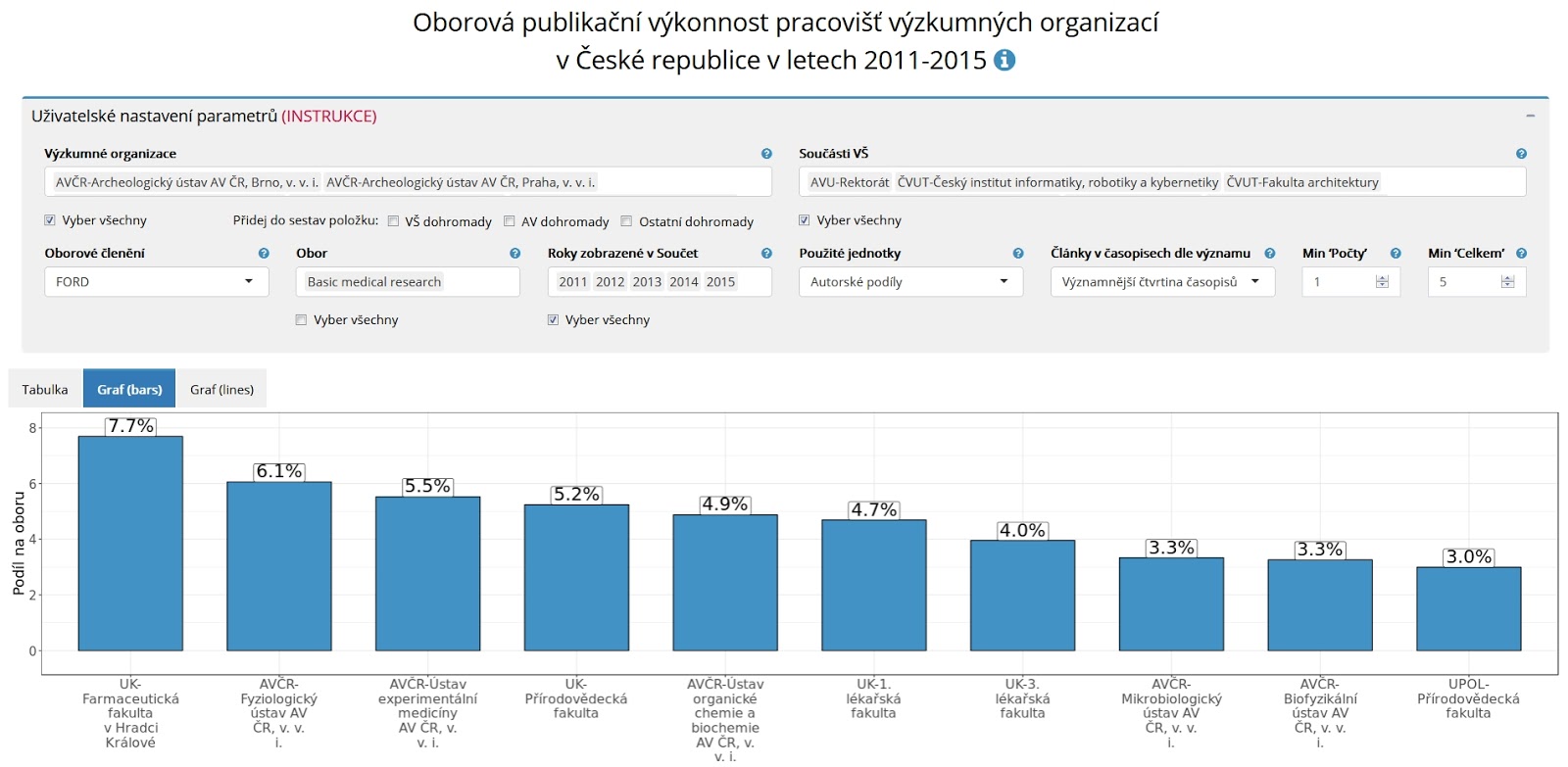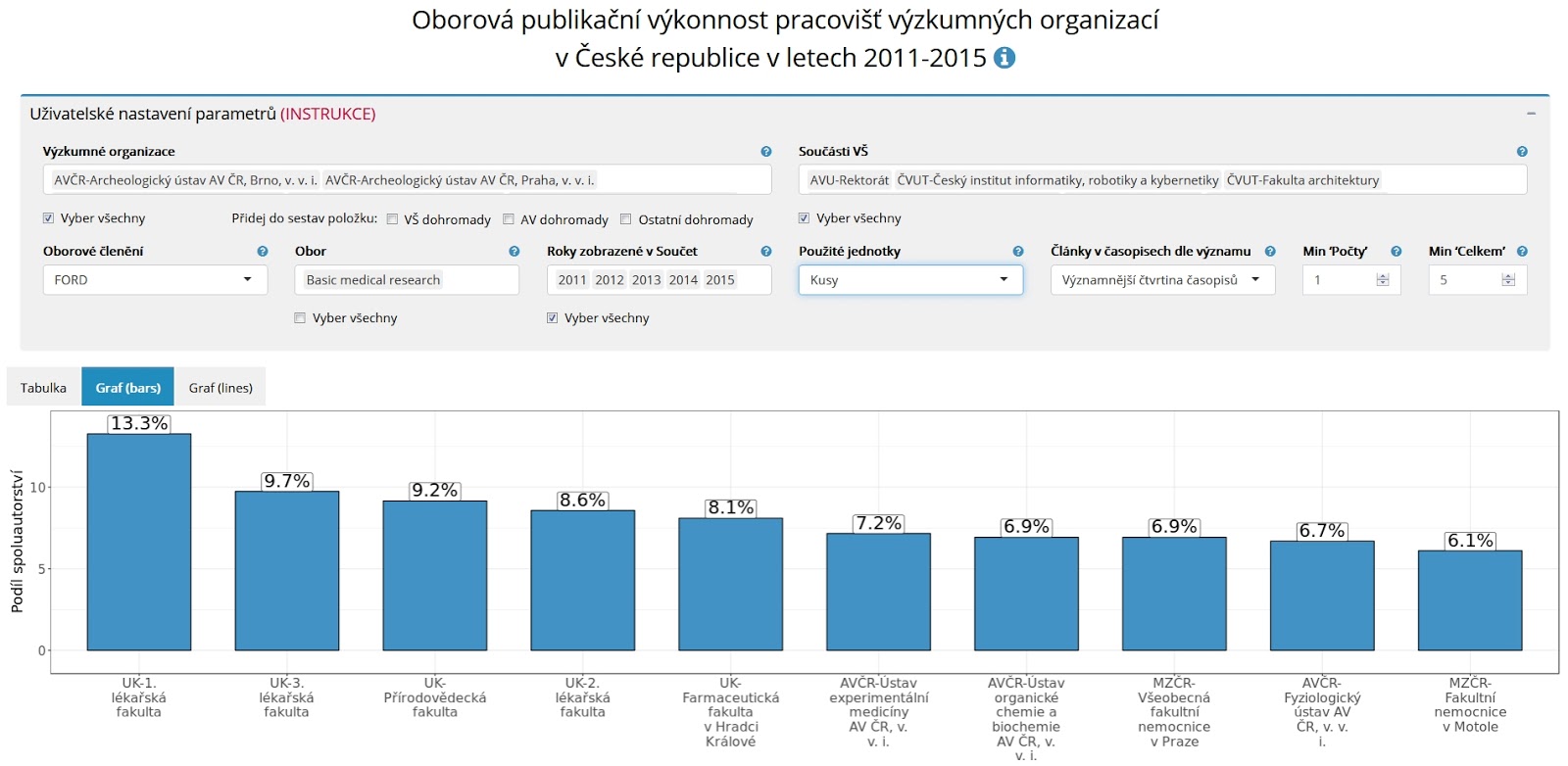 A nemohu si odpustit už notoricky známé varování: z této aplikace se o publikační produktivitě opět nic nedozvíte. Opravdu nic! Jinými slovy, neřekne vám nic o efektivitě pracoviště co do využívání finančních prostředků a lidských zdrojů. Můžete mít dvě pracoviště se stejným publikačním výkonem, ale to menší z nich pak má výrazně vyšší publikační produktivitu než pracoviště větší.