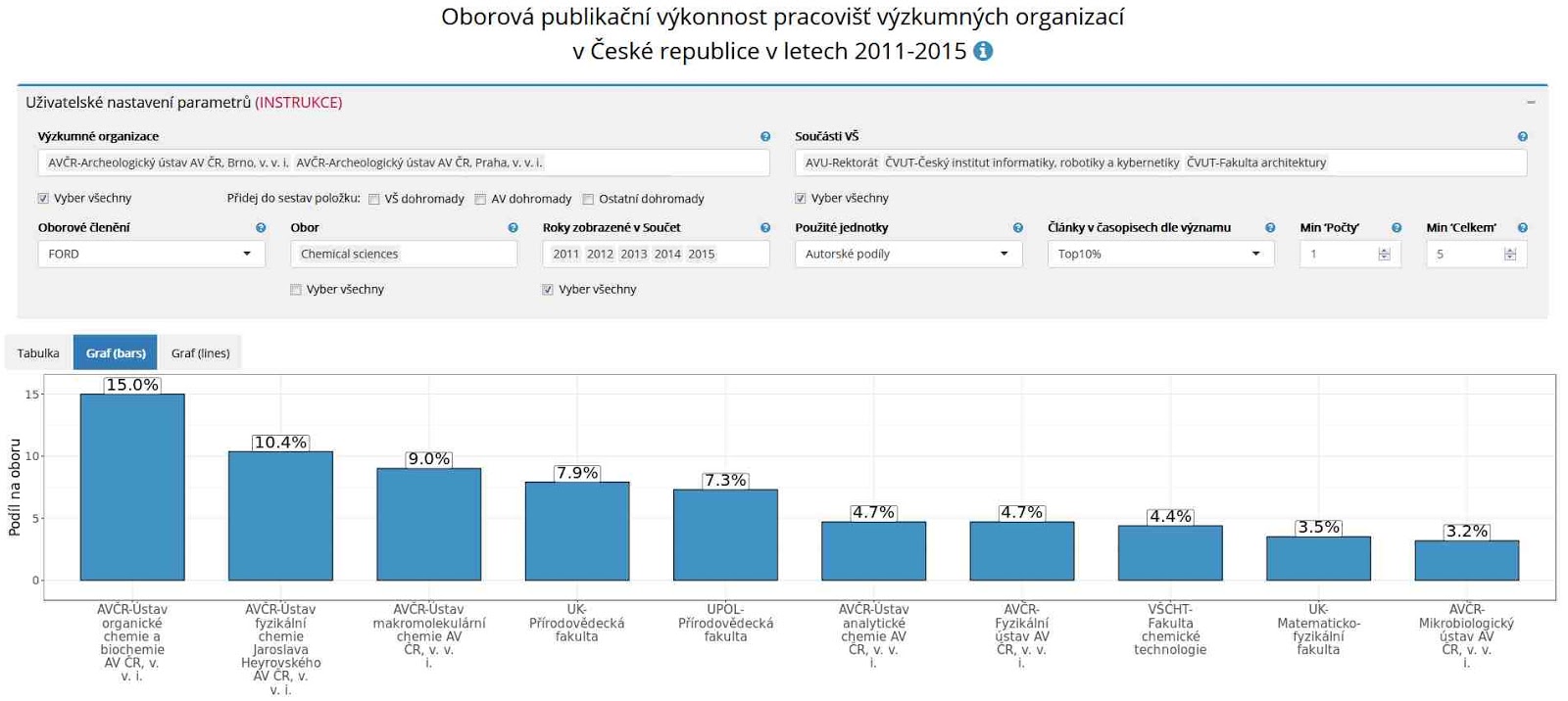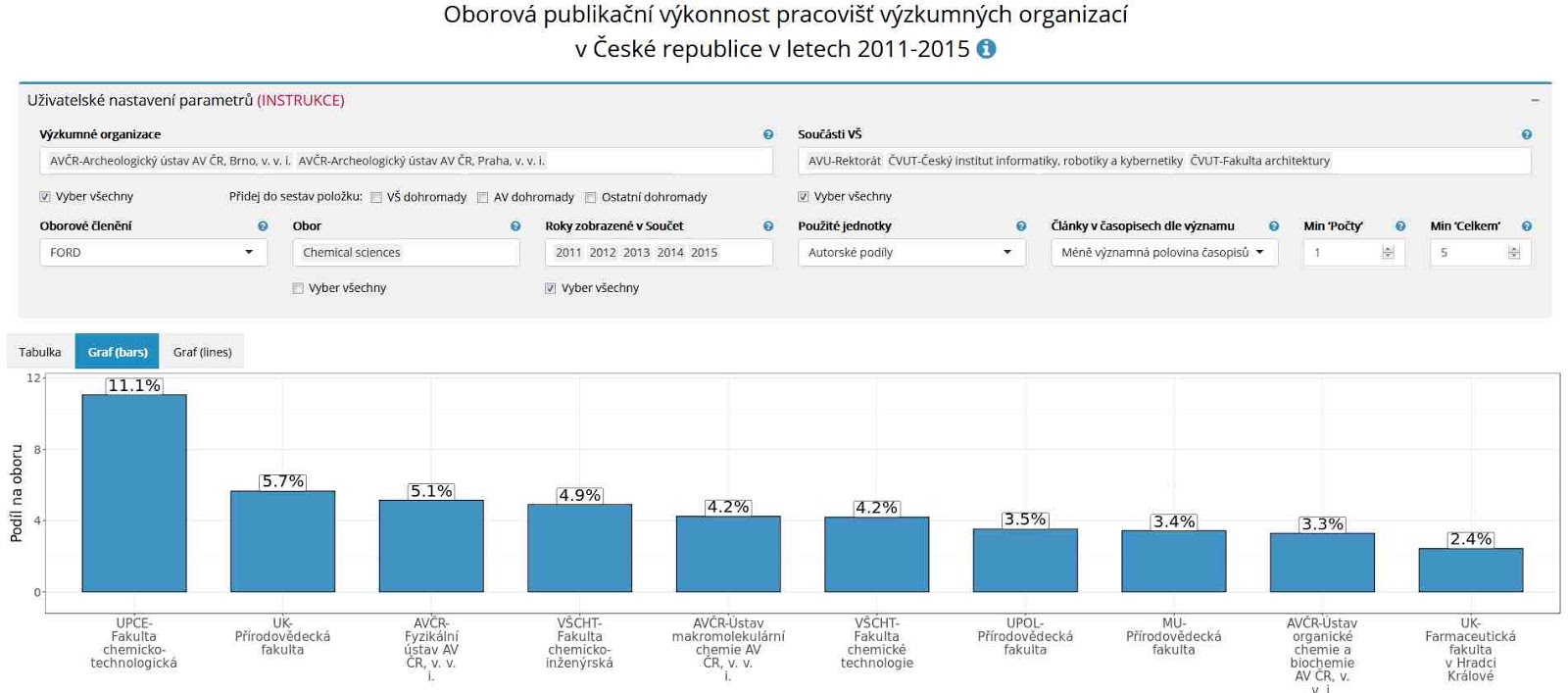 Třeba na výkon v méně vlivné polovině časopisů má smysl se dívat, když zjišťujete, která pracoviště se soustředí spíše na kvantitu než na kvalitu publikací. Není náhoda, že pořadí pracovišť se výrazně liší podle toho, jak významný publikační výkon si zvolíte. Zkuste si třeba vybrat obor FORD = Chemical Sciences, Použité jednotky = Autorské podíly a srovnejte si pořadí pro články v Méně významné polovině časopisů s nastavením Top 10 % časopisů a dostanete tyto dva výsledky.