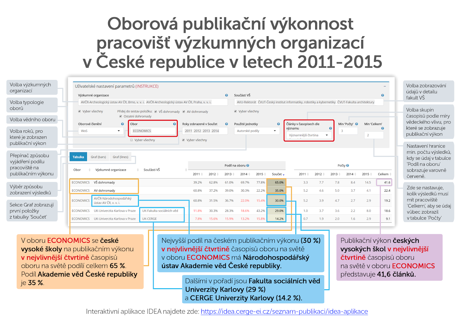 Jde o další v řadě [1|2|3|4] internetových nástrojů IDEA ukazující vědecké oborové publikační výkony výzkumných pracovišť. Jako v minulosti je rozlišován málo, více a nejvíce vlivný výzkum. Toto "kvalitativní" rozlišení je extrémně důležité, protože kvantita - prostý počet vědeckých článků - o ničem moc nevypovídá. S každou další aplikací se posouváme kupředu a i v této poslední je řada novinek. Například lze: