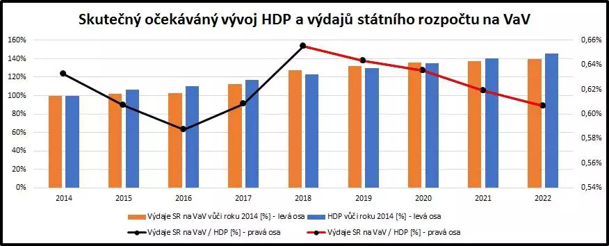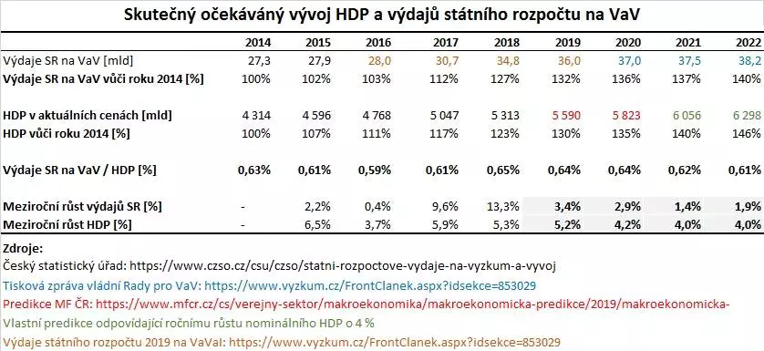 Dle aktuální predikce ministerstva financí poroste v letech 2019 a 2020 nominální HDP o 5.2 % a 4.5 %, aby se v letech 2021 a 2022 růst usadil na celkem vlažných 4 %. Z toho zhruba 2 p.b. představuje reálný růst HDP a 2 p.b. důsledek růstu cen (deflátor). Aby v tom samém období držely výdaje SR na VaV s růstem HDP krok, musely by růst obdobnými tempy. Jenomže růsty plánované vládní Radou jsou výrazně nižší: 3,4 %; 2,9 %; 1.4 %; 1.9 %. Tempo je to zhruba jen poloviční.