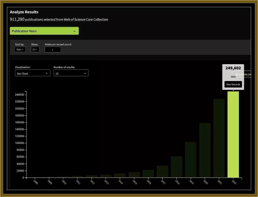 Graf 1: Počty článků (Articles a Reviews) publikovaných nakladatelstvím MDPI v letech 2008-2022 rostly geometrickou řadou, každoročně o téměř 50 %. V roce 2021 nakladatelství MDPI publikovalo již téměř čtvrt milionu článků. V roce 2022 by se počet mohl přiblížit půl milionu (data za rok 2022 totiž zdaleka nejsou v lednu 2023 konečná). To by představovalo 1370 článků vydaných každý den. Pokud si MDPI za průměrný článek účtuje 1000 eur, za těch půl milionu článků v roce 2022 MDPI vyinkasovalo půl miliardy euro (125 mld Kč, což je zhruba roční rozpočet Česka na platy učitelů). Články MDPI v roce 2021 představují celou třetinu všech (nejen MDPI) článků databáze WoS v roce 2010.