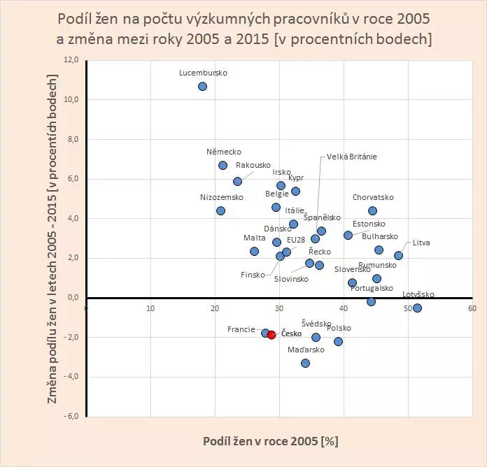 Dlouhodobě se ví, že zapojení žen do procesů výzkumu, vývoje a inovací (VaVaI) je v Česku na evropsky velmi nízké úrovni. Jiná vládní strategie, Národní politika VaV, to kapírovala natolik zmateným způsobem, že se jí postulovaným slibům a cílům věc napravit ani nedalo moc věřit [1]. Vlastně pak není divu, že již tak velmi nízká míra zapojení žen do VaVaI se do roku 2015 včetně snižovala (Obr 1). Přitom v naprosté většině zemí EU míra zapojení žen rostla a to včetně zemí, kde byla míra zapojení vyšší než v ČR již v roce 2005. Ano, můžeme se chlácholit že stejně neslavně s lidskými zdroji se zachází i ve Francii.