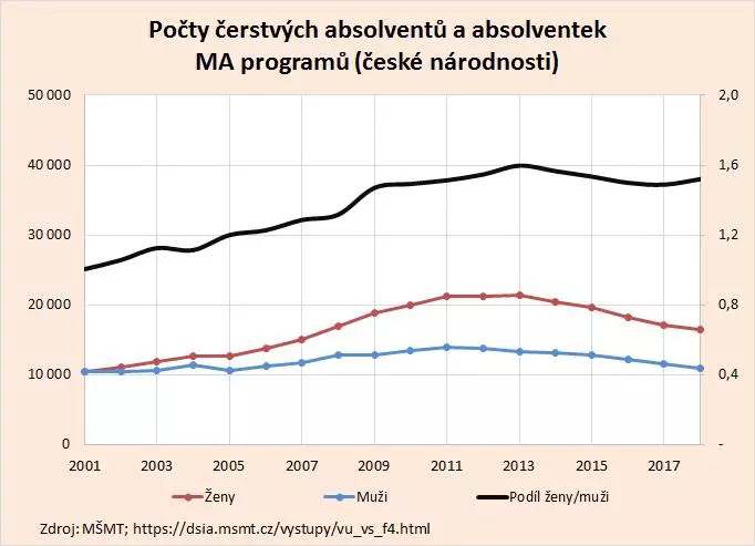 Obr 2: Počet čerstvých absolventek MA programů českých vysokých škol už dávno výrazně překonal počty čerstvých absolventů