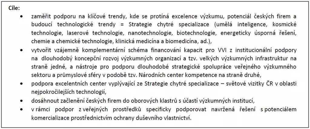 V předmluvě Strategie je uváden velmi ambiciózní cíl: Jsme připraveni do oblasti vědy, výzkumu a inovací investovat rekordní množství zdrojů s cílem vytvořit z České republiky zemi, která se stane nejen symbolem znalostí a pokročilých technologií, ale rovněž hostitelem nejvýznamnějších světových vědeckých kapacit.... Cílem je proto do r. 2025 dosáhnout umístění v kategorii tzv. Strong Innovators a do r. 2030 být ve vedoucí evropské skupině, tzv. Innovation Leaders. Čtrnáctá pozice v EU v hodnocení GII a třinácté místo dle kritérií IOI nás řadí do přesného průměru evropské osmadvacítky. Cílem je proto zařadit se do r. 2025 do první desítky a do r. 2030 do první sedmičky zemí EU, a to jak v rámci GII, tak IOI.