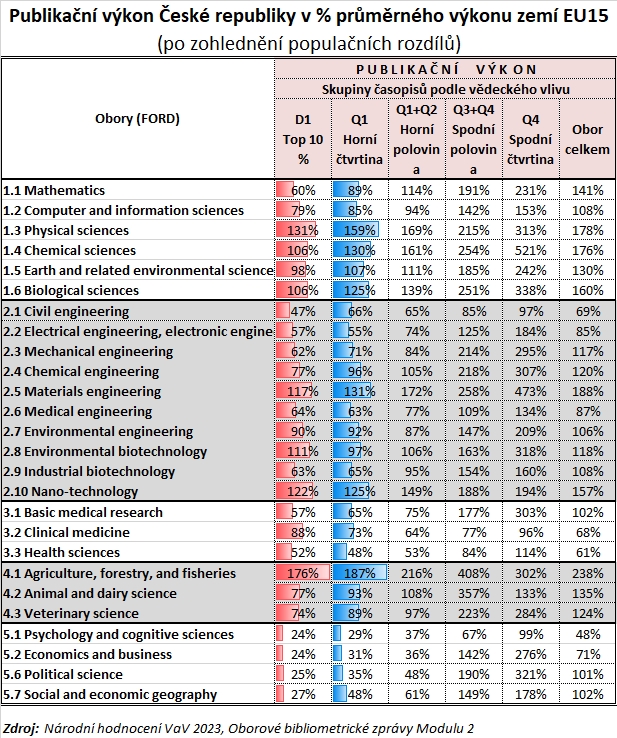 Publikační výkon oboru také nese velmi důležitou informaci. Říká nám, kolik „vědy" se vlastně v tom kterém oboru dané země dělá. Všichni čtenáři jistě ví, že zde nehovořím o celkovém počtu článků, ale pouze o článcích ve významných a celosvětově renomovaných časopisech. Z bibliometrických zpráv loňského Hodnocení 2023 jsem vyzobal potřebné údaje. V Tabulce 1 vidíte oborové publikační výkony Česka v % průměrného výkonu zemí EU15, samozřejmě po zohlednění populačního rozdílu zemí. Barevně jsou zvýrazněny podíly v případě výkonů ve vědecky nejvlivnější desetině (D1) a čtvrtině časopisů (Q1).