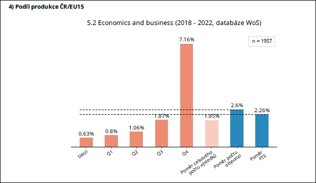 Oborový publikační výkon Česka můžete zjistit z Grafu 2 oborového Reportu 1 ve stejném ZIP souboru na str. 6. Zde si už ale musíte otevřít Report za každý obor zvlášť. Už ale také víme, že publikační výkon je do velké míry dán personální velikostí oboru. Takže publikační výkon Česka, sám o sobě, o ničem významnějším nevypovídá. Vypovídací hodnotu má až srovnání publikačního výkonu oboru Česka se zeměmi EU15. Toto srovnání v Grafu 2 naštěstí je. Ale musíme mít stále na paměti, že mezinárodní rozdíly v publikačním výkonu oboru jsou dány jak rozdíly v personálních velikostech oboru, tak v publikačních produktivitách oboru. Rozklíčovat z tohoto grafu, co je co, ale už bohužel nelze.