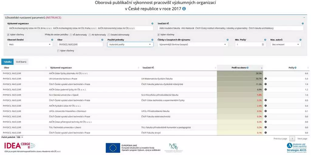 - Problematické je, že formulka články počítá jako kusy a nezohledňuje autorské podíly VŠ. Na tom vydělaly VŠ působící v oborech, kde jsou běžné autorské megakolaborace se stovkami až tisícovkami externích spoluautorů. Exemplárním případem budiž nukleární fyzika. V této aplikaci a na Obrázku 2 si můžete ověřit, že fakulty jako MFF UK nebo FJFI ČVUT vykazují v tomto oboru velmi vysoké fyzické počty článků (50) a (29), které však po zohlednění autorských podílů dělají pouze 5,3 a 1,9, tedy desetkrát méně (Obrázek 3). VŠ, které se jadernou fyzikou nezabývají, jsou pak v nevýhodě. Bylo by proto na hlavu, kdyby například dvě zmíněné VŠ peníze RVO od MŠMT mezi své fakulty rozdělily stejnou metodou jako MŠMT.