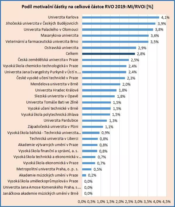 Zbylých 2,8 % balíku RVO, 192 milionů Kč tzv. motivační složky, bylo mezi VŠ rozděleno na základě zbrusu nového principu. Slovy MŠMT: "...v závislosti na podílu VŠ na počtu článků v 1. a 2. kvartilu rozložení četností výsledků všech oprávněných žadatelů podle mezinárodního pořadí článků AIS." Procentní nárůst celkového rozpočtu RVO jednotlivých VŠ pak ukazuje Graf 1.