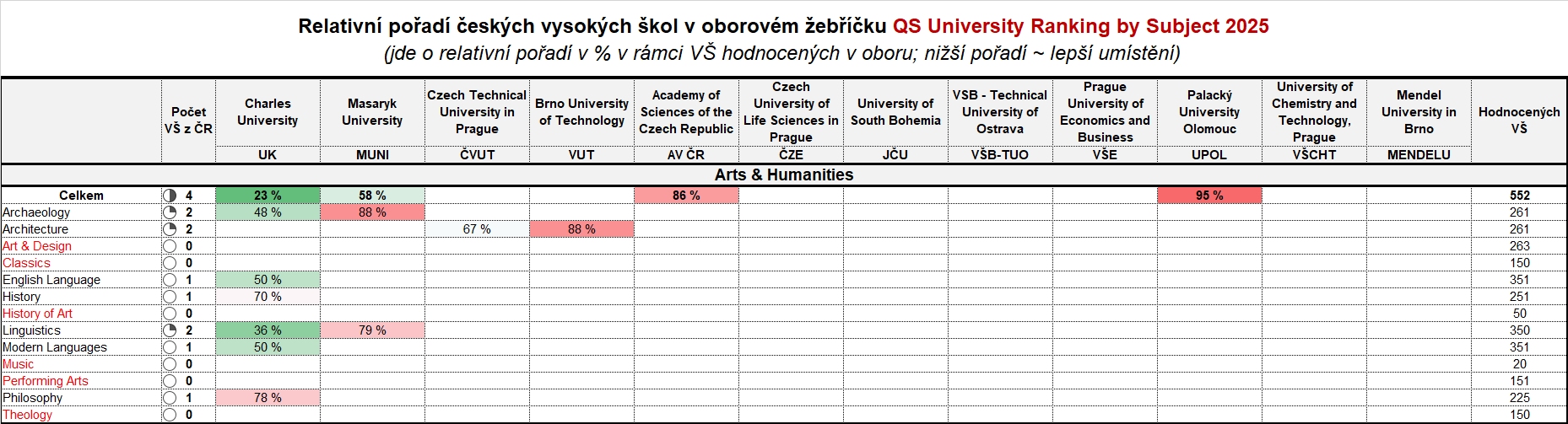 Pro snazší čtení tabulek koreluje barevné pozadí políček s percentilovým pořadím. Umístění v horní části oborového pořadí odpovídá zelenému pozadí, čím tmavší tím lepší. Umístění ve spodní části QS seznamu pak odpovídá barvě červené, čím tmavší tím horší.