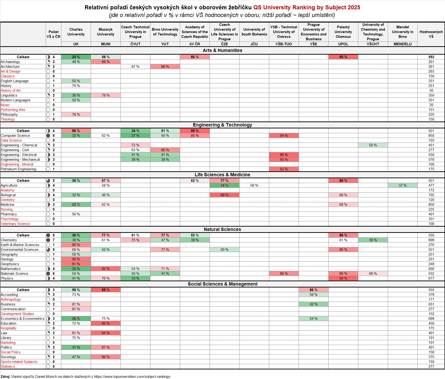 - Zajímavé je, v kolika oborech a hlavně v jakých nemá Česko na žebříčku QS zastoupení žádné. V tabulkách jde o obory označené červeným textem. S ohledem na společensko–ekonomické potřeby země je, myslím, k vážnému zamyšlení česká absence zejména v těchto: Psychology, Data Science, Development Studies, Social policy, Hospitality, Nursing, Theology.