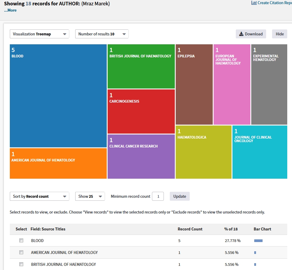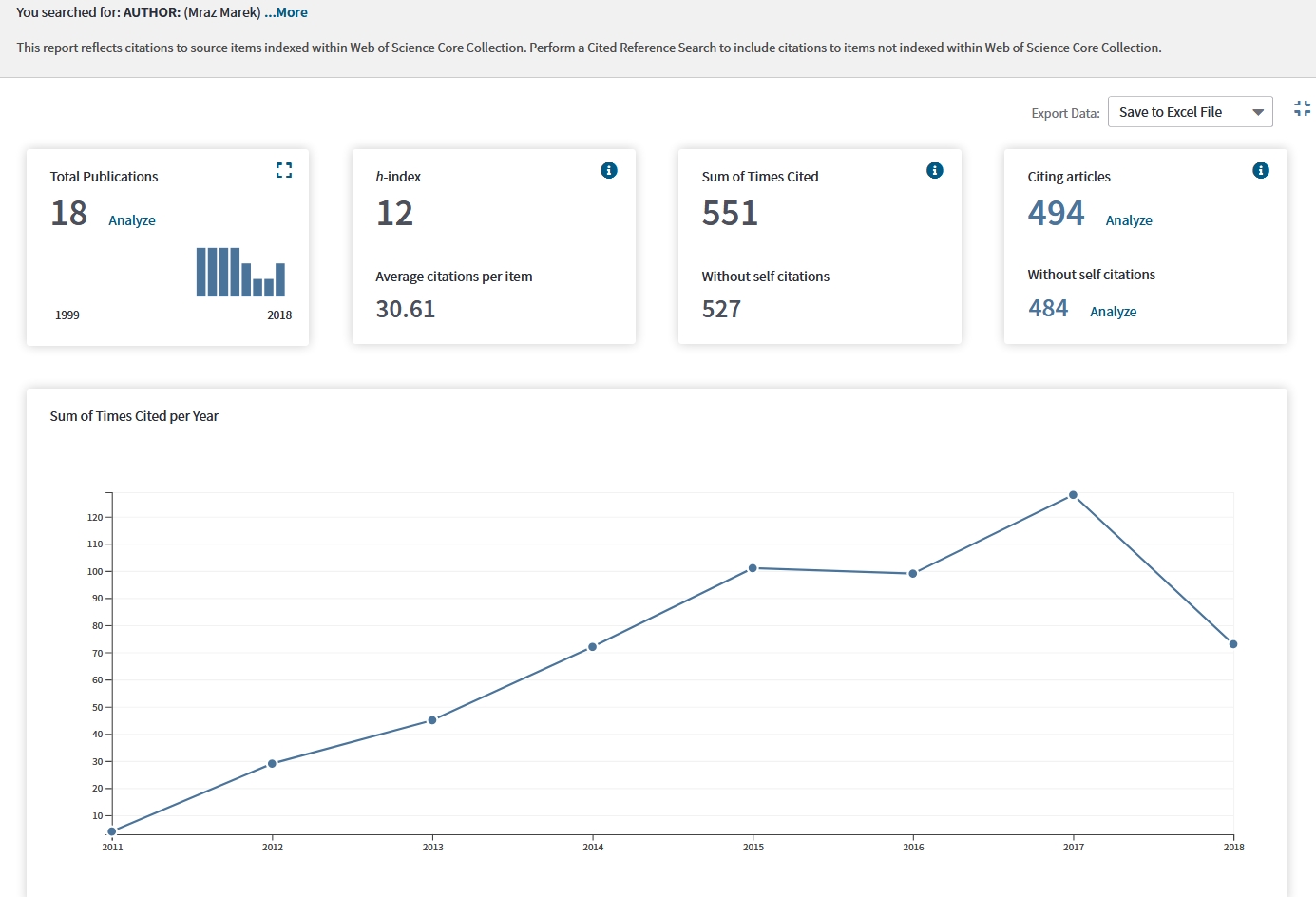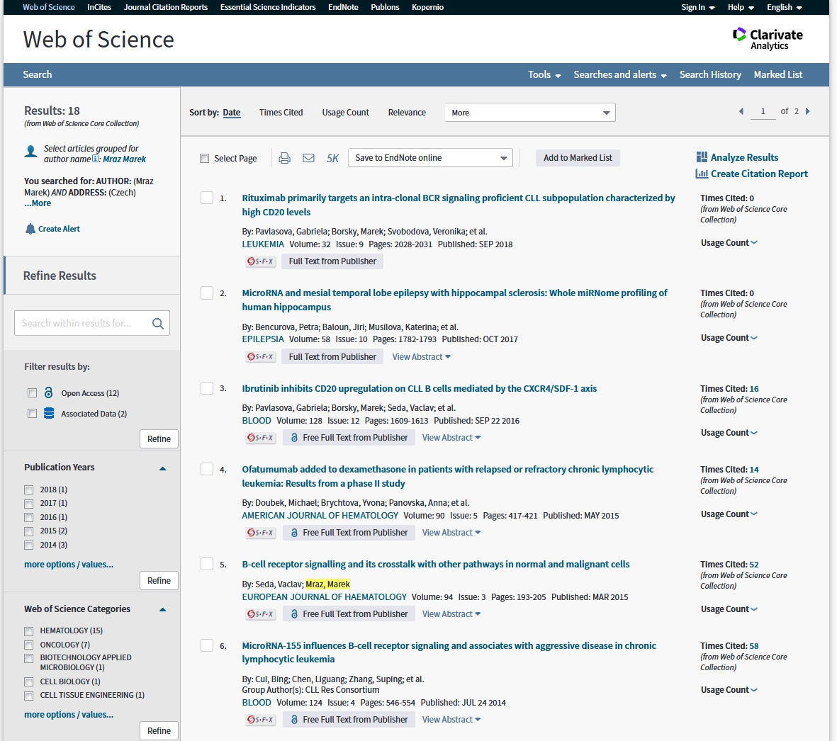 Pak už jen stačí vyhledat vědecké publikace (obrázek 1 a 2) Marka Mráze v databázi WoS. Marků Mrázů se ale ve světě vědy pohybuje více. Takže bylo třeba ze seznamu nalezených publikací vyřadit ty, které spadají do jiných oborů nebo jsou příliš staré, aby byly od něj. Také jsem raději odfiltroval méně významné typy publikací než jsou Articles a Reviews. Po čištění v mém seznamu zbylo 18 zářezů z let 2014 - 2018.