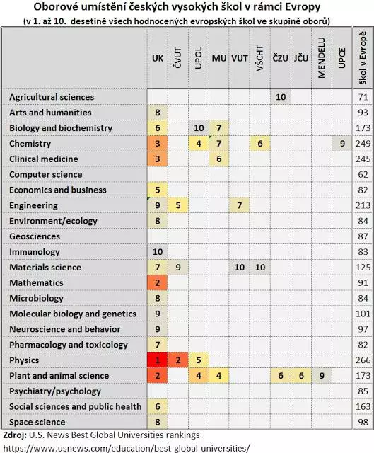 Naopak v evropské špičce (1. a 2. desetina škol) se umístila pouze Univerzita Karlova a to v oborových skupinách Mathematics, Plant and Animal Science a Physics a ještě ČVUT v posledně zmiňovaném oboru.