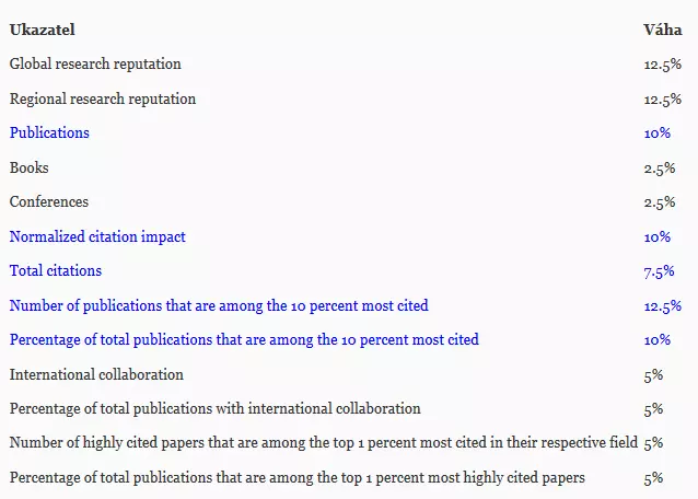 Pozn: Téměř třetinovou váhu mají v celkovém skóre počty a podíly článků vysoce citovaných článků (celkem 32.5 % = 12.5% + 10% + 5 % + 5%).