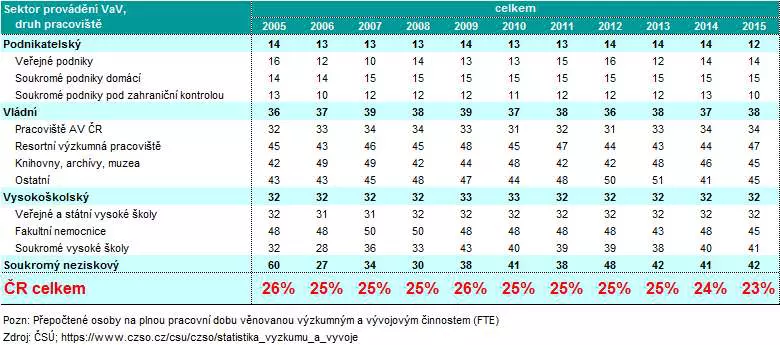 V posledních deseti letech se tento podíl dokonce dále snižoval, jak lze nahlédnout z údajů ČSÚ níže. Na poklesu se výrazně podílel podnikatelský sektor a stagnace podílu žen v jinak personálně expandujících veřejných vysokých školách. Naopak mírný růst zastoupení žen ve vědě zaznamenala pracoviště Akademie věd ČR (z 32 % na 34 %) a velmi výrazný růst soukromé vysoké školy, jejichž role v české vědě je však zanedbatelná.