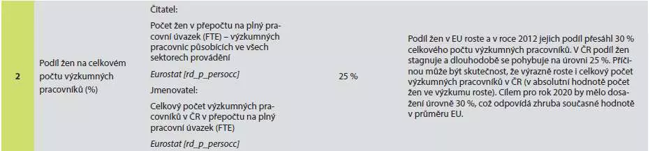 Str. 64: Podíl žen v EU roste a v roce 2012 jejich podíl přesáhl 30 % celkového počtu výzkumných pracovníků. V ČR podíl žen stagnuje a dlouhodobě se pohybuje na úrovni 25 %. Příčinou může být skutečnost, že výrazně roste i celkový počet výzkumných pracovníků v ČR (v absolutní hodnotě počet žen ve výzkumu roste). Cílem pro rok 2020 by mělo dosažení úrovně 30 %, což odpovídá zhruba současné hodnotě v průměru EU.