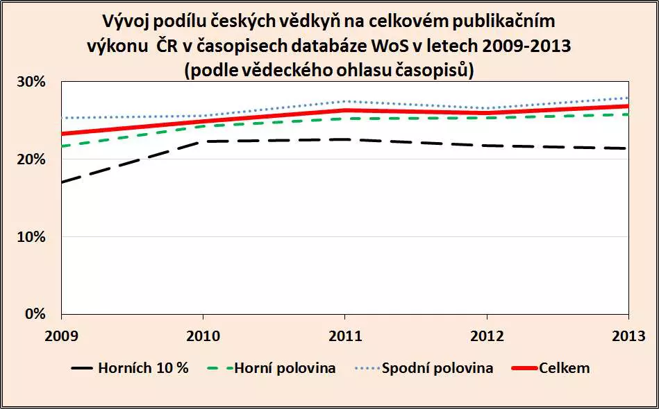 Podíl žen v české vědě zůstává velmi nízký. Podíl na vědeckém publikačním výkonu je ještě nižší. A ještě nižší je jejich podíl na publikacích nejšpičkovějších. Trendy navíc zlepšení neslibují. O příčinách této situace nadále panují hlavně dohady založené na nejrozmanitějších osobních zkušenostech a dojmech. Kvalitních analýz a výzkumů na toto téma je málo a stát si žádné nezadává.