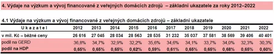 Jsou tedy ty tři miliardy na vědu a výzkum navíc oproti letošnímu roku „velký úspěch“? Ani v nejmenším to úspěch není. V následující tabulce Českého statistického úřadu jsou uvedeny výdaje financované z domácích veřejných zdrojů, tedy státního rozpočtu, na výzkum, vývoj a inovace v letech 2012–2022, a to v běžných cenách, i jako podíl na HDP, což je základní všeobecně používaná míra výše výdajů.