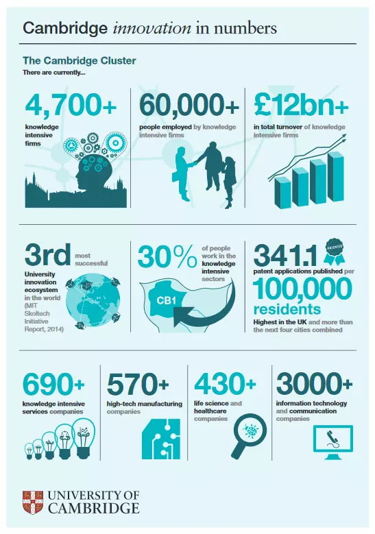 Například v rámci výzkumného klastru univerzita provozuje Centrum korporátního výzkumu, které využívají firmy jako Microsoft, Toshiba či Unilever. Funguje tu 19 vědeckých a obchodních parků, šest inkubátorů a akcelerátorů, množství tzv. angel investorů, venture capital fondů a obchodních sítí, pořádá se tu řada aktivit na podporu podnikání. Cambridge Enterprise dále nabízí možnost smluvního výzkumu, ochrany a správy duševního vlastnictví, služby investičního fondu atd. A je v tom tak dobrá, že je bez problémů konkurenceschopná.
