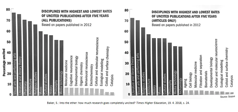 Analýza byla vytvořena na základě bibliometrických dat z databáze Scopus napříč jednotlivými disciplínami či oblastmi. Bylo sledováno, jaké procento publikací vzniklých v roce 2012 je, resp. není citováno do pěti let od svého zveřejnění. A závěr? 72 % článků v literární vědě a 55 % článků v historii není do pěti let citováno vůbec. Oproti tomu necitovány jen v řádu jednotek procent zůstaly články chemické, biologické či medicínské.
