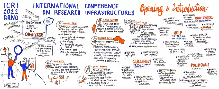 Účastníci mezinárodní konference o výzkumných infrastrukturách ICRI 2022 byli možná hned při vstupu do sálu překvapení – čekala tam velká bílá tabule a fixy; co dělalo vybavení, které znají z učeben a laboratoří, na vědecké konferenci? Vysvětlení s úsměvem podávala Bea Brosková, vizuální zaznamenávačka. „Pečlivě poslouchám a vizuálně zaznamenávám hlavní body a klíčové myšlenky – tvořím vizuální zrcadlo toho, co se v sále děje,“ objasňuje princip vizuálních poznámek, běžný koncept ze světa byznysu a korporací, který je pro vědu spíše novinkou. „I pro mě to byla první vědecká konference, ale při skečnoutingu na tématu nezáleží. Někdy mám skoro pocit, že je lepší, když tématu nerozumím – lépe se mi vybírají ty skutečně hlavní a podstatné myšlenky, nenechám se strhnout detaily.“