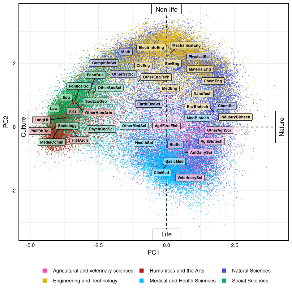 Unikátnost mapy spočívá v tom, že díky jejímu sémantickému podkladu můžeme interpretovat nevyřčené principy klasifikace v prostoru vědění podle koncentrace témat a oborů na protilehlých pólech souřadnicového systému. To znamená, že v mapě lze smysluplně navigovat. Hlavní osa v naší interpretaci zachycuje protiklad mezi kulturou a přírodou, zatímco druhá je postavena na kontrastu živých a neživých objektů výzkumu.