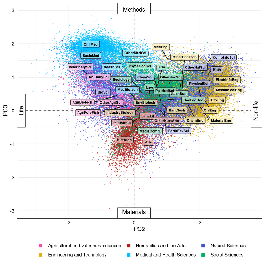 Geometrická technika mapování má navíc tu výhodu, že dovoluje prozkoumávat i další dimenze prostoru vědění. Řez daty sestavený ze druhé a třetí osy tak nabízí zcela jiný pohled, který vedle toho, zda jsou předměty výzkumu životné, či neživotné, zohledňuje i to, do jaké míry se badatelé soustředí na jejich popis, nebo nakolik vyzdvihují jejich zpracování pomocí vědeckých metod. Zde se ukazuje, že kromě humanitních věd převažují v tematickém zaměření vědců metodologické akcenty, přičemž nejvíce jsou zdůrazňovány v medicínských a informatických oborech. Střed mapy je tentokrát zaplněn především sociálně-vědními výzkumníky, což v kontextu geometrické – na rozdíl od síťové – mapy musíme vnímat tak, že jsou pro ně tyto rozdíly méně významné.