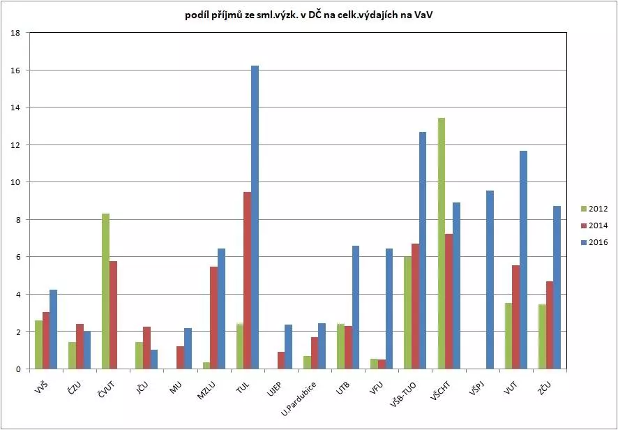 Za poslední odstavec přidávám výsledek zpracování dat z výročních zpráv o hospodaření veřejných vysokých škol. Odpověď tudíž rozšiřuji vložením čtvrtého odstavce. „Z analýz příjmů veřejných vysokých škol ze smluvního výzkumu v doplňkové činnosti vychází výrazně pozitivní efekt investic ze strukturálních fondů do některých regionálních výzkumných center. Jak je vidět na grafu, podíl příjmů ze smluvního výzkumu na celkových výdajích na výzkum a vývoj se u některých vysokých škol mezi lety 2012 a 2016 znásobil. Platí to zejména pro Technickou univerzitu v Liberci (TUL), kde podíl v roce 2016 překročil 16 %, což je o dva procentní body více než pro všechny německé univerzity (rok 2014). Podobné zvýšení vidíme i u dalších technických vysokých škol, Univerzity Tomáše Bati ve Zlíně (UTB), Vysoké školy báňské - technické univerzity Ostrava (VŠB-TUO), Vysokého učení technického v Brně (VUT), Západočeské univerzity v Plzni (ZČU). Tyto výsledky ukazují, že řada výzkumných center naplňuje projektové záměry a stává se tolik potřebnými zárodky spolupráce mezi univerzitním výzkumem a podniky.“