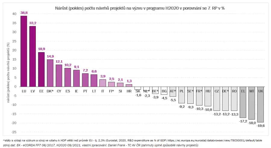 Při porovnání počtu návrhů projektů s účastí jednotlivých členských států jsou patrné rozdíly v jejich zapojení do výzev obou programů. U některých členských států se projevil vysoký nárůst v počtech návrhů projektů přepočtených na výzvu v programu H2020 v porovnání se 7. rámcovým programem: Lucembursko (+38,8 %), Lotyšsko (+33,2 %), Estonsko (+18,9 %) a Dánsko (14,9 %).