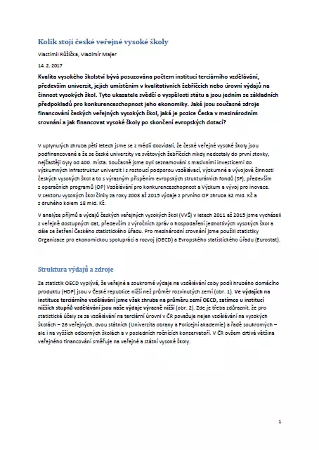 Kvalita vysokého školství bývá posuzována počtem institucí terciárního vzdělávání, především univerzit, jejich umístěním v kvalitativních žebříčcích nebo úrovní výdajů na činnost vysokých škol. Tyto ukazatele svědčí o vyspělosti státu a jsou jedním ze základních předpokladů pro konkurenceschopnost jeho ekonomiky. Jaké jsou současné zdroje financování českých veřejných vysokých škol, jaká je pozice Česka v mezinárodním srovnání a jak financovat vysoké školy po skončení evropských dotací?