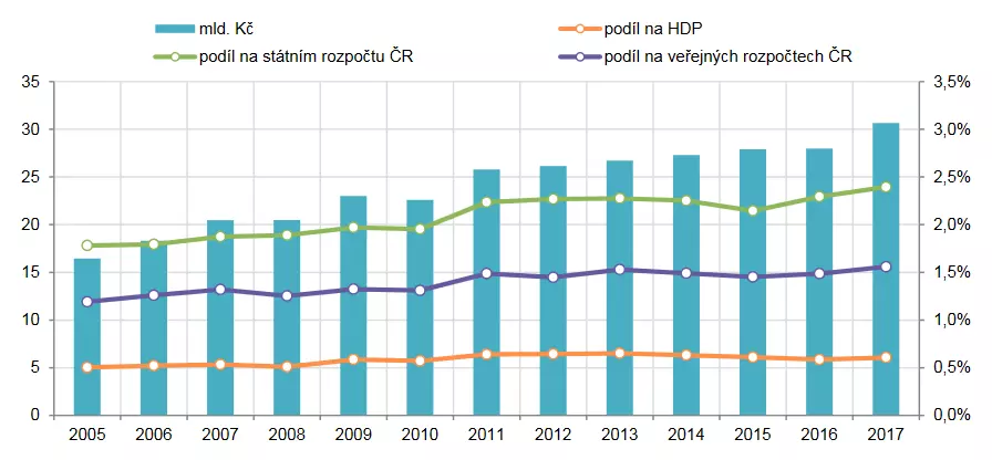 I v loňském roce mírně převažovalo účelové financování (15,5 mld. Kč) nad institucionálním. Tento trend je patrný od roku 2011 a je důsledkem čerpání prostředků z operačních programů EU, které jsou ve statistice řazeny pod účelovou podporu. Výjimkou byl rok 2016, kdy díky skončení čerpání z programového období 2007 až 2014 došlo k vyrovnání obou složek státních rozpočtových výdajů.