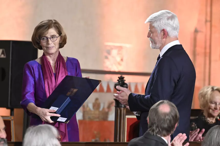 Hana Dvořáková přebírá od prezidenta Petra Pavla vyznamenání za zásluhy o stát v oblasti vědy.