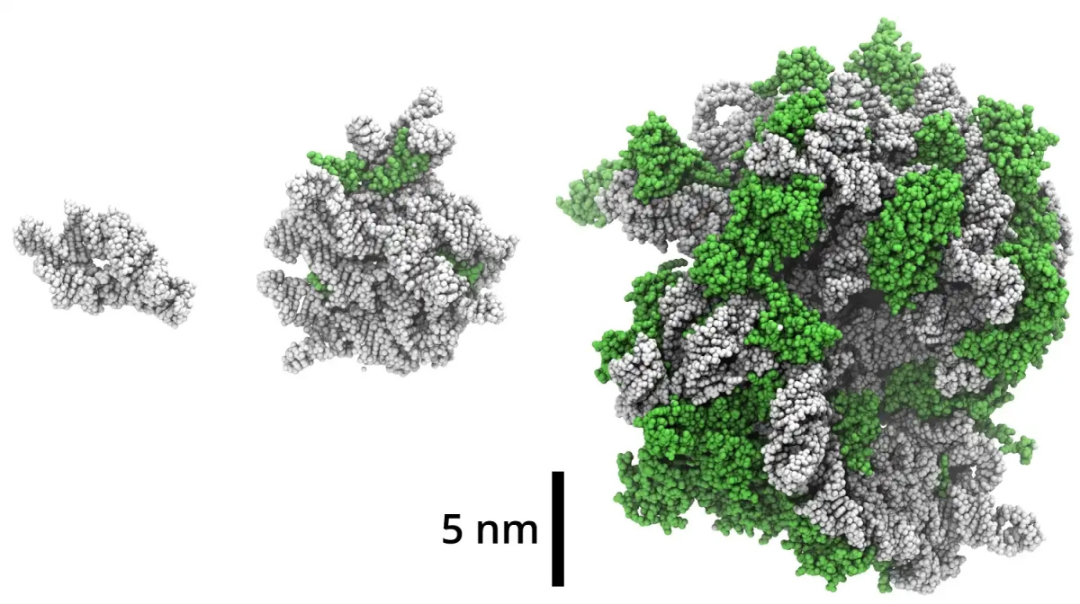 Studované protoribozomy (vlevo a uprostřed) v kontextu současného bakteriálního ribozomu (vpravo). RNA je šedě, proteiny zeleně. Malý protoribozom ze studie se skládá pouze z RNA, na větší protoribozom se váže několik krátkých proteinů.