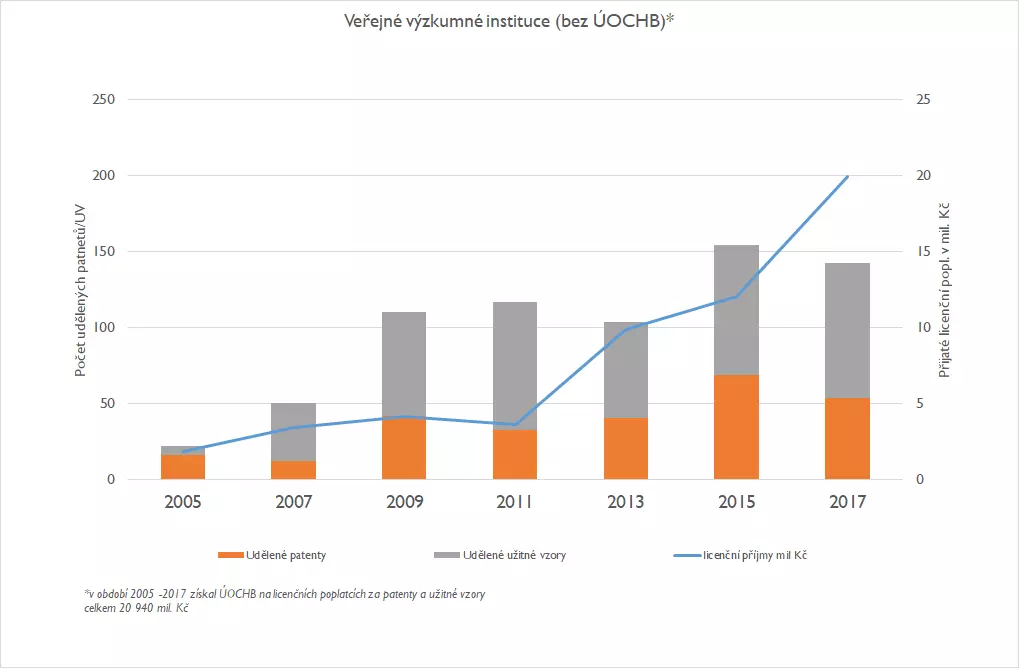 Veřejným výzkumným institucím bylo (při nezapočítání ÚOCHB) v roce 2008 uděleno 27 patentů, respektive 54 patentů v roce 2017. Na poplatcích v daných letech získaly 3,2 mil. Kč (rok 2008), resp. 19,8 mil. Kč v roce 2017.