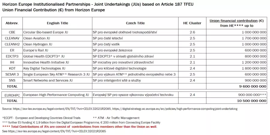 Tyto společné podniky, resp. tato evropská partnerství, fungující v programu Horizont Evropa pod jeho druhým pilířem „Globální výzvy a konkurenceschopnost evropského průmyslu“ mají z programu Horizont Evropa do roku 2027 k dispozici rozpočet ve výši přibližně 10 miliard € (podrobněji tab. 1). Tento rozpočet je doplněn minimálně stejnou částkou „neunijních" investic od dalších zúčastněných partnerů v těchto partnerstvích. Očekává se, že společný finanční příspěvek z unijních a dalších zdrojů bude znamenat další investice pro oblasti zdraví, dopravy, energetiky, digitálních technologií, vytvoří nová pracovní místa, podpoří ekonomický růst a bude mít dlouhodobý pozitivní vliv na životní prostředí a společnost.