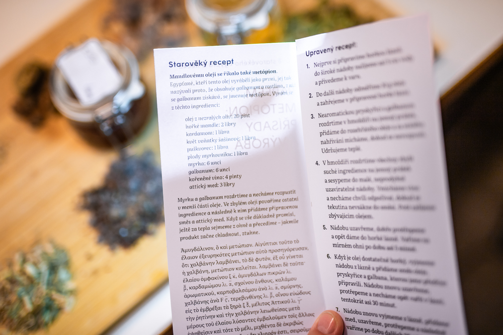 Samotné recepty zapsané na zdech jsou velmi dlouhé a komplexní texty. „Výroba takového ‚parfému‘ mnohdy trvala i několik let a vyžadovala mnoho ingrediencí a kroků. Například recept na egyptský ‚olej‘ zvaný medžet začíná popisem toho, jak správně chovat a posléze porazit býka, jehož tuk se po roce použije jako základ pro samotný výrobek,“ vysvětluje Diana Míčková.