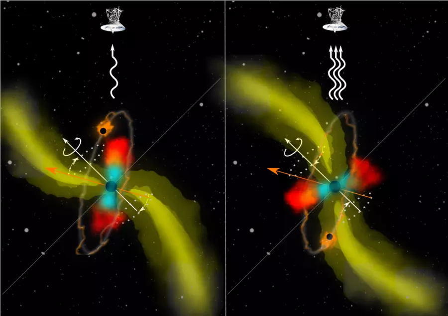 Popis obrázků: Ilustrace znázorňující jet (žlutá) konající precesy v důsledku supermasivní binární černé díry v centru galaxie. Větší supermasivní černá díra je znázorněna černě v centru uvnitř akrečního disku, který obsahuje teplejší (modrá) i chladnější (červená) plyn. Bílá šipka označuje rotaci větší černé díry. Druhá černá díra obíhá (oranžově) kolem centrální supermasivní černé díry a oranžová šipka ukazuje orientaci jejího orbitálního momentu hybnosti. V důsledku vychýlení pohání otáčivý moment sekundární černé díry precesi akrečního disku i jetu (zelený kroužek a šipky). Rádiová emise je vyznačena bílými zakřivenými čarami. Radioteleskop ukazuje směr k pozorovateli na Zemi. Oba obrázky názorně ukazují, jak se jet stáčí a jak vzniká proměnlivost rádiové emise. Jet na obrázku vpravo se otáčí směrem k pozorovateli, a proto se na obloze jeví jasnější - proto je viditelná silnější rádiová emise.