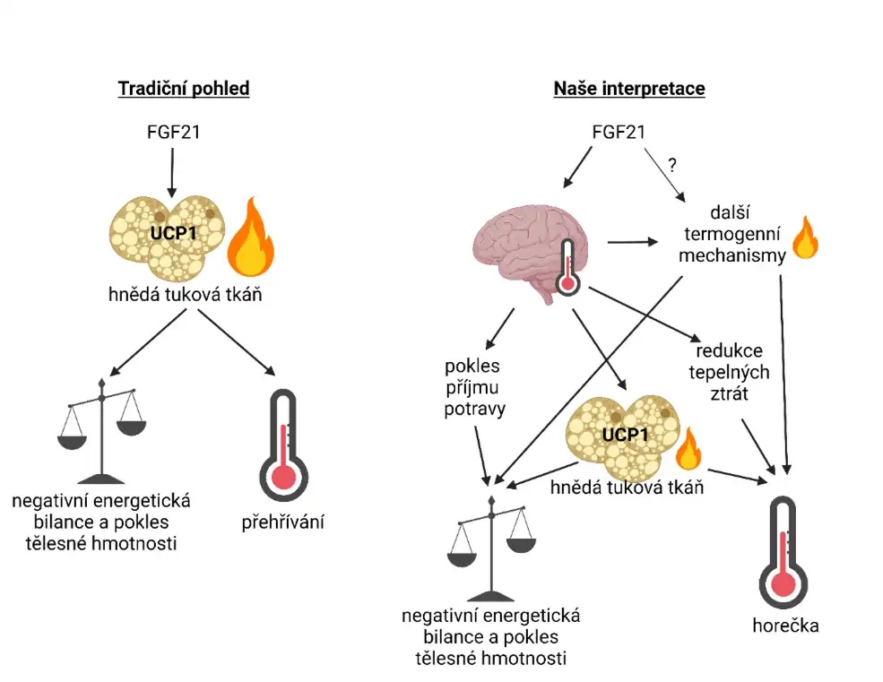 Obezita je dána nerovnováhou mezi energetickým příjmem a výdejem. Lze proti ní proto bojovat jednak snížením příjmu potravy (ať už s pomocí diet nebo nových léků ovlivňujících pocit sytosti), jednak zvýšením fyzické aktivity či klidového metabolického obratu. Významná část klidového energetického výdeje je (v závislosti na teplotě okolí) vynaložena na udržování stálé tělesné teploty. K tomu savci využívají celou paletu mechanismů, jako je například svalový třes nebo netřesová termogeneze. Ta probíhá zejména v takzvané hnědé tukové tkáni, která obsahuje speciální mitochondriální protein UCP1 (z angl. Uncoupling protein 1 čili odpřahovací protein 1). Právě tady zasahuje FGF21: jeho podávání zvyšuje u laboratorních zvířat expresi UCP1, energetický výdej i tělesnou teplotu. Může se tedy zdát, že stimulace UCP1 vede k nadbytečné výrobě tepla, což se projeví jednak spalováním tukových zásob, jednak zahřátím organismu a snahou ochladit se (Obr. 1). Jak ale zjistil výzkumný tým vedený Petrem Zouharem, situace je výrazně složitější.