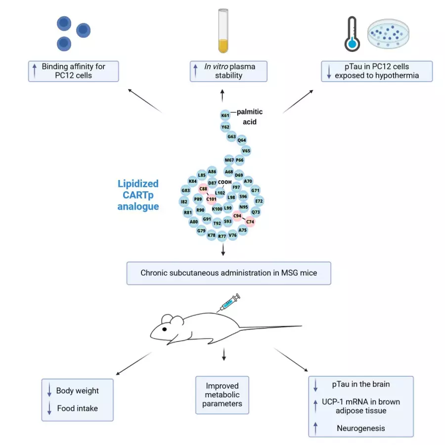 Upravený peptid je odvozený od přirozeného peptidu CART. Po opakovaném podání myším trpícím obezitou a prediabetem začaly myši méně jíst, zhubly a zlepšil se jejich metabolismus. Jejich mozek vykazoval sníženou patologii proteinu Tau a v mozku se též začaly tvořit nové nervové buňky.