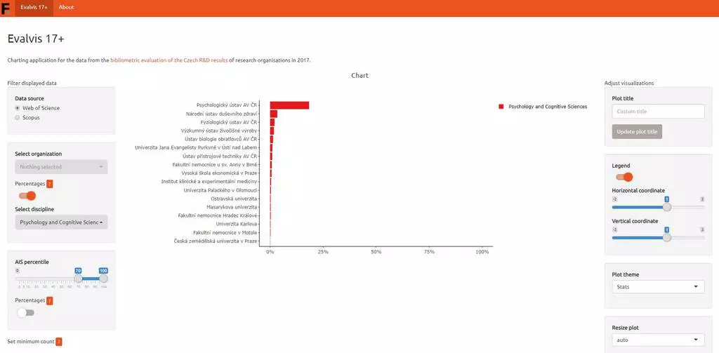 Badatelé z Kabinetu pro studium vědy, techniky a společnosti Filosofického ústavu AV ČR naprogramovali aplikaci, která umožňuje vizualizovat data z hodnocení výzkumných organizací podle Metodiky 2017+. Navázali tak na předchozí debaty, během nichž zaznamenali potřebu například Akademie věd ČR či Grantové agentury ČR vylepšit přístup k datům o české vědě.
