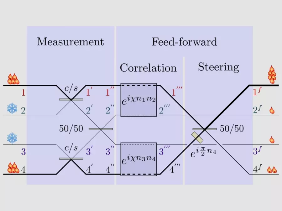„Zjistili jsme, že pomocí působení, kterému se v optice říká kerrovská nelinearita, zde může dojít k přesunu části energie z jednoho ‚horkého‘ vlákna, kterým proudí fotony, do tří zbývajících vláken. Na tom, že přejde část energie z ‚horkého‘ na ‚studené‘, není nic zvláštního. Zároveň se ale v tomto případě může stát i opak, kdy druhé ‚horké‘ vlákno s fotony se díky přenosu energie z prvního vlákna může zahřát ještě více, než bylo na počátku. Dochází tak ke koncentraci energie podobně jako v tepelném stroji. Naše optické zařízení je nejmenší dosud známý systém, u kterého k takovémuto energetickému přesunu může dojít,“ řekl Šimon Bräuer, doktorand na katedře optiky a spoluautor článku.