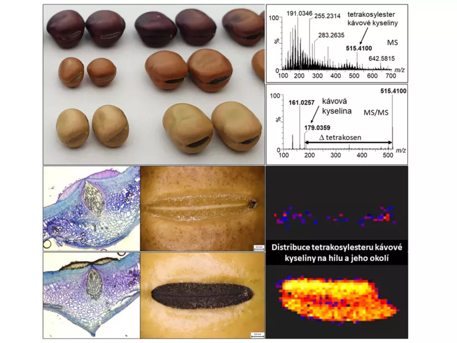 Semena bobu s viditelným pupkem (hilem) zbarveným v důsledku aktivity enzymu polyfenoloxidasy (PPO) a fragmentační spektrum fenolických látek.