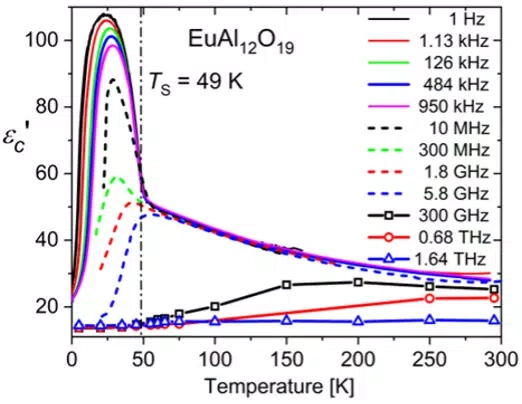 Závislost elektrické permitivity EuAl12O19 na frekvenci elektrického pole a na teplotě. Změny chování u 49 K souvisejí se vznikem dipolární kapaliny.