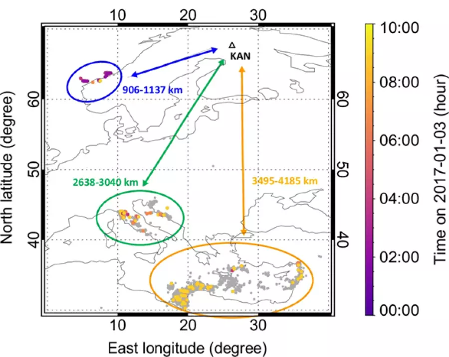 Tři bouřkové systémy zásobující 3. ledna 2017 hvizdovod poblíž polární observatoře Kannuslehto ve Finsku, označené černým trojúhelníkem a zkratkou KAN. Norská bouře, spojená s cyklónem Axel, je zakroužkována modře, zelený ovál označuje středomořskou bouři na Apeninském poloostrově a na Jadranu, rozsáhlá bouře ve východním středomoří a u afrického pobřeží je označena žlutě.