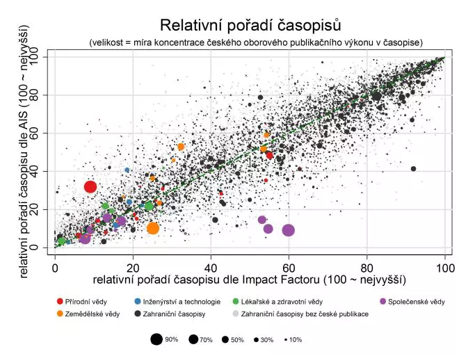 Český publikační výkon v řadě oborů se koncentruje v českých a slovenských časopisech, z nichž většina má relativně nízký jak AIS tak IF. IF a AIS několika českých časopisů se nachází zcela mimo ve světě přirozený rámec hodnot.