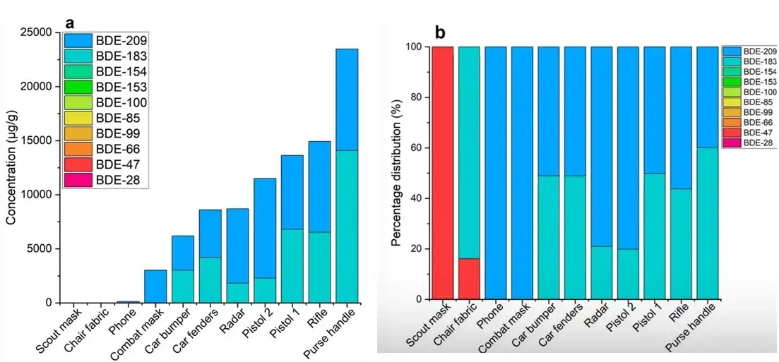 a) Koncentrace v μg/g a b) procentuální rozložení PBDEs v dětských hračkách zakoupených ve Francii