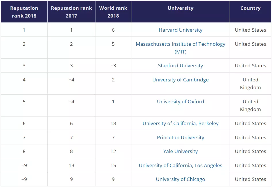 Na konci května 2018 vyšel nový žebříček vysokých škol od společnosti Times Higher Education (THE). Tentokrát se soustředí na reputaci vysokých škol a od ostatních žebříčků se tak liší v metodologii. Výsledky potvrzují dominanci univerzit z USA, ty čínské si na rozdíl od ostatních žebříčků nepolepšily.