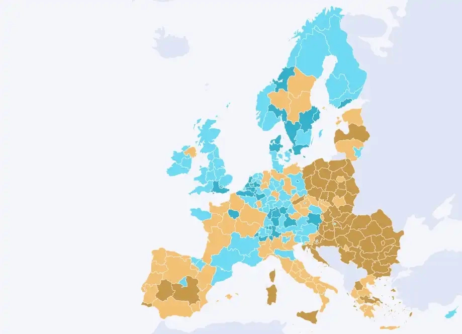 Regionální rozdíly ve výkonnosti v oblasti výzkumu a inovací. Hnědá barva značí skupinu vznikající inovátoři, žlutá mírné inovátory a odstíny modré pak silné inovátory./ Foto: Regional Innovation Scoreboard 2024
